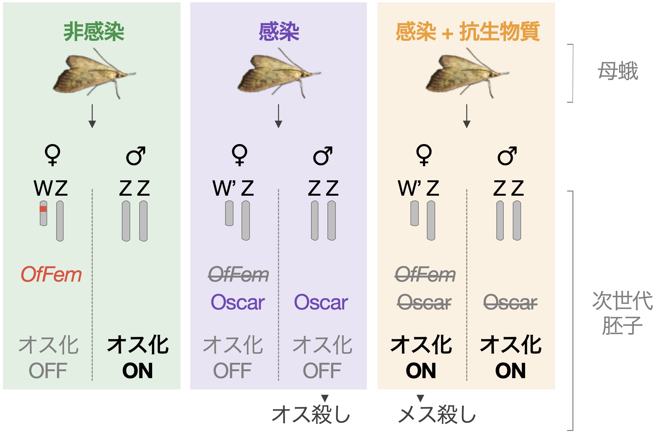 チョウ目昆虫のアワノメイガにおいては、共生細菌Wolbachiaの感染によりオスのみが致死する「オス殺し」現象が知られています。これは、Wolbachiaのもつタンパク質Oscar(オス狩る)が、宿主のオス化を阻害することにより起こります。一方、抗生物質を用いて感染アワノメイガからWolbachiaを除去すると、オス殺しとは逆にメスのみが致死する「メス殺し」が起こります。我々は今回、Wolbachiaの感染歴を持たないアワノメイガを用いてメス化因子OfFemを同定し、これが感染アワノメイガにおいてゲノムから失われていることを示しました。このことから、感染アワノメイガはWolbachiaとの長期間にわたる共生の過程でメス化(=オス化阻害)のしくみをOscarに依存するようになり、もはやWolbachiaなしではメス化できなくなったと考えられます。