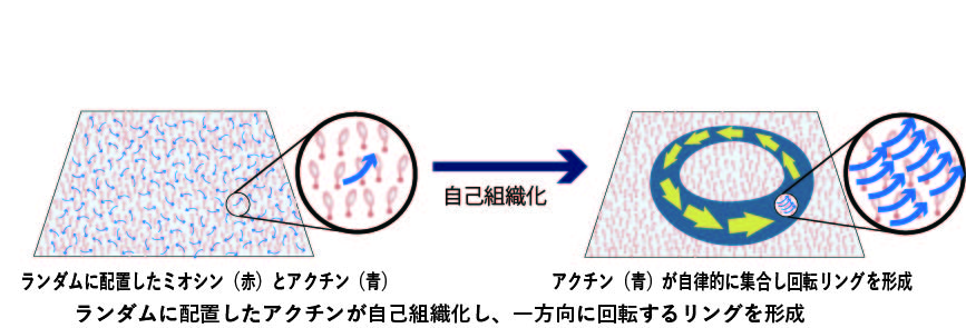 細胞内では、多くのタンパク質や構造体が秩序だった配置をとり、細胞の形や働きを支えています。しかし、このような秩序がどのように生み出されるのかという基本原理は、これまで十分に理解されていませんでした。本研究では、分子モーターであるミオシンとアクチンという2種類のタンパク質だけで、秩序だった構造が自発的に形成される仕組みを明らかにしました。具体的には、ランダムに存在するアクチン繊維がミオシンとの相互作用によって自律的に集合し、一方向に回転し続けるリング状の構造を形成することを発見しました(図)。この結果は、細胞内の秩序構造やキラリティ(左右非対称性)が、分子モーターの働きを起点として自然に生み出され得ることを示しています。本研究は、生命の形づくりの原理を理解するうえで重要な成果であるとともに、自律的に動くバイオ材料の設計など、医療やナノテクノロジーへの応用につながる可能性があります。